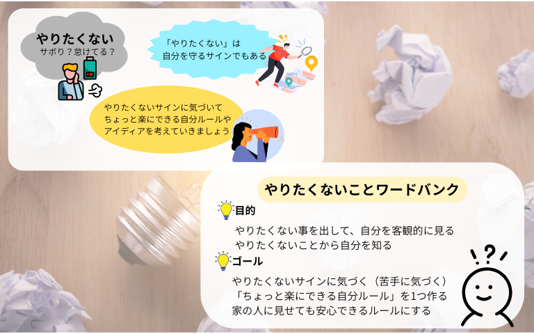 この講座では「やりたくない」という感覚を否定するのではなく、自分の心や体を守るためのサインとして捉えることを出発点としました。そのうえで、やりたくないけれど避けられないことに対して「全部やる/全部やらない」の二択ではなく、「少しだけ楽にできる工夫(自分ルール)」を考えていくことを目的としています。