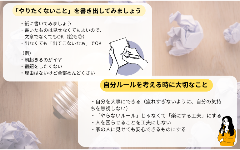 その上で、「自分を大事にできて、人を困らせず、家の人に見せても安心できる“自分ルール”」を考えました。自分ルールは「やらないためのルール」ではなく、自分を守りながら少し前に進むための工夫として位置づけています。