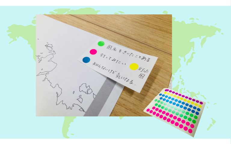 白地図に国名だけが書かれたものを用意し、「名前を知っている国」「行ってみたい国」「行ったことのある国」「なんか気になる国」の4種類のシールを使って、参加者それぞれが“自分だけの世界地図”を作りました。