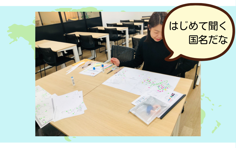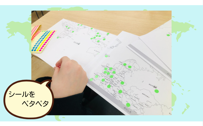 シールを貼ってみると、「知っている国って意外と多い!」と気づく一方で、「こんな長い国名のがあるんだ」等と新しい発見も。行ってみたい国は、少し悩みながらシールを選んでいました。職員も、自分が旅行した国の思い出を話しながら楽しんで参加しました。