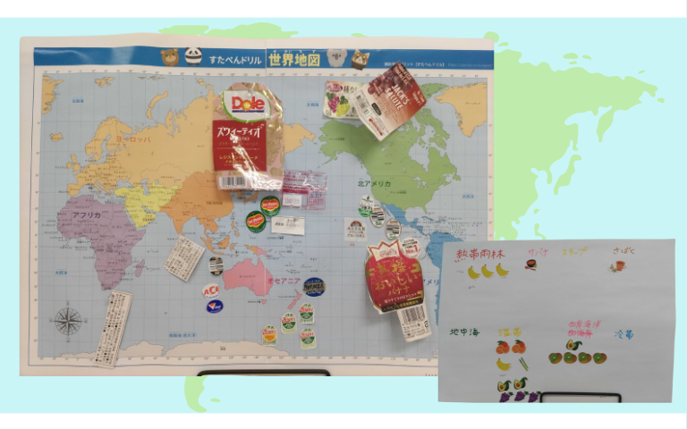 ちなみに、世界地図第1弾では、家庭で購入した輸入野菜や果物の「原産国シール」を集めて地図に貼ったり、気候帯ごとに作物を並べたりと、理科と社会が融合したようなワークに取り組んでいます。
