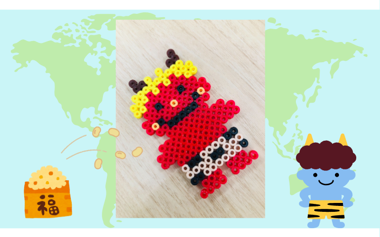 この日は節分!休憩時間に鬼のアイロンビーズを作ってもらい、かざりました。