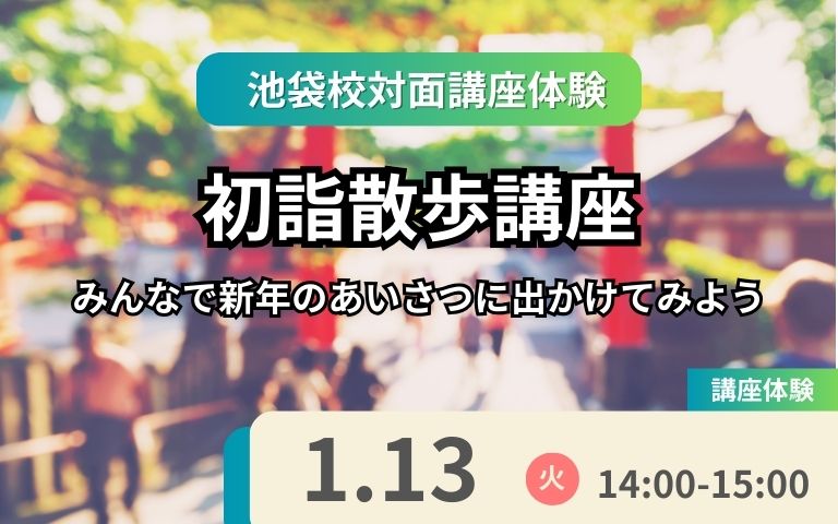 池袋(対面)講座体験お申込みはこちらから 内容 1月 13日(火) 初詣散歩 ~新年の風を感じる時間を過ごそう~14日(水) 卓球・ふうせんバレー ~身体を動かす活... -